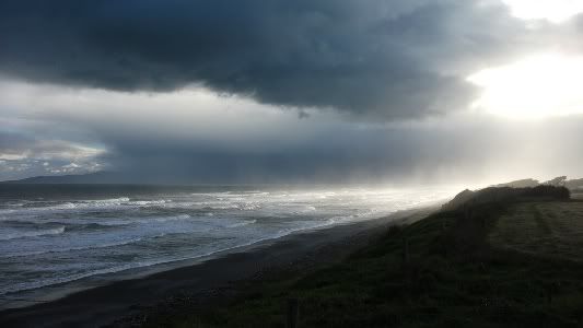 The most south-western point of the NZ highway system. The sun shone over the incoming rain.